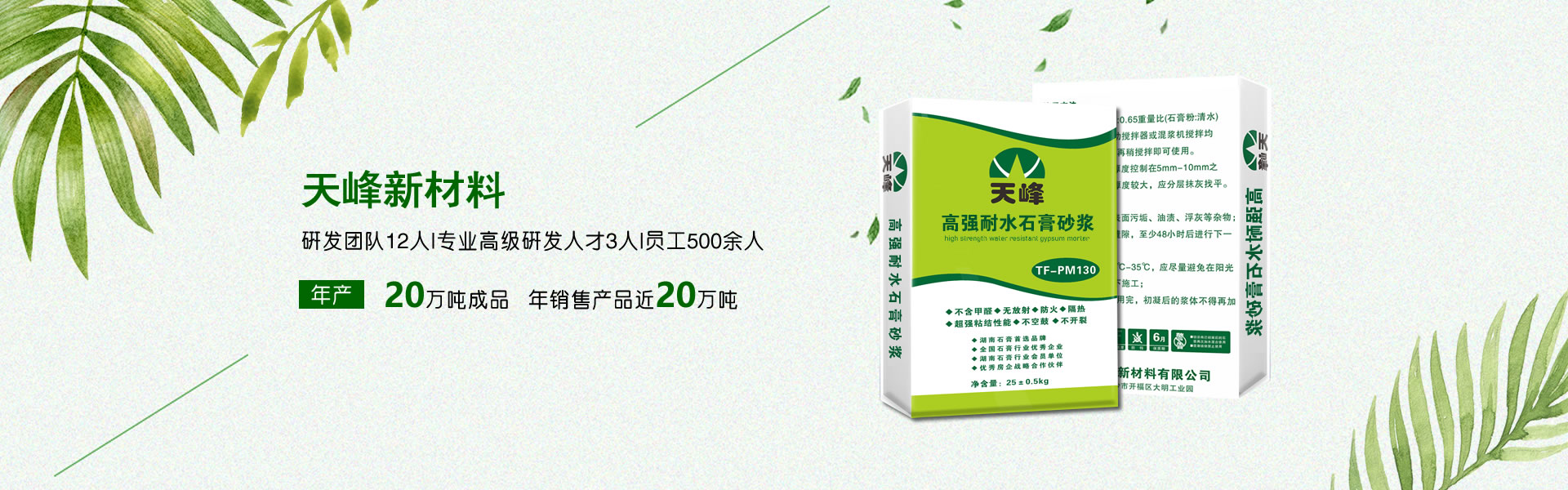 湖南天峰新材料有限公司成立于2020年,注冊(cè)資金1080萬元整,是一家專業(yè)從事石膏砂漿,石膏基建筑材料輔料,特種砂漿,混凝土外加劑的研發(fā),生產(chǎn),銷售及裝飾裝修專業(yè)分包的企業(yè)。依托湖南大學(xué)、中南大學(xué)專家教授團(tuán)隊(duì),擁有雄厚的技術(shù)實(shí)力,現(xiàn)有研發(fā)團(tuán)隊(duì)12人,專業(yè)高級(jí)研發(fā)人才3人,員工500余人,年生產(chǎn)能力20萬噸成品,年銷售產(chǎn)品近20萬噸。 未來三至五年內(nèi),公司規(guī)劃在北京、武漢、廣州、上海、成都、西安、鄭州等地建立產(chǎn)品制造基地及相應(yīng)的商務(wù)中心,技術(shù)研發(fā)中心,產(chǎn)品制造及銷售服務(wù)平臺(tái),向客戶提供可靠的服務(wù)和支持,同時(shí)建立創(chuàng)新的伙伴關(guān)系,全面實(shí)施國家的藍(lán)天環(huán)保戰(zhàn)略。